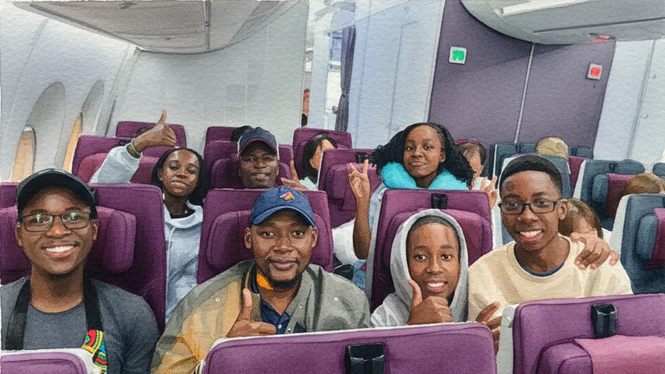 Meanwhile, in Zimbabwe, a student boarded the plane with her teacher, both flying for the first time. For this eleven-year-old orphan who once whispered she wanted to be an engineer, life has accelerated in the span of a year. She joined her school’s STEAM club, found confidence in the encouragement around her, teamed up with a classmate, and won the national WRO finals. Now the wings outside the aircraft mirror the wings she has grown within herself.